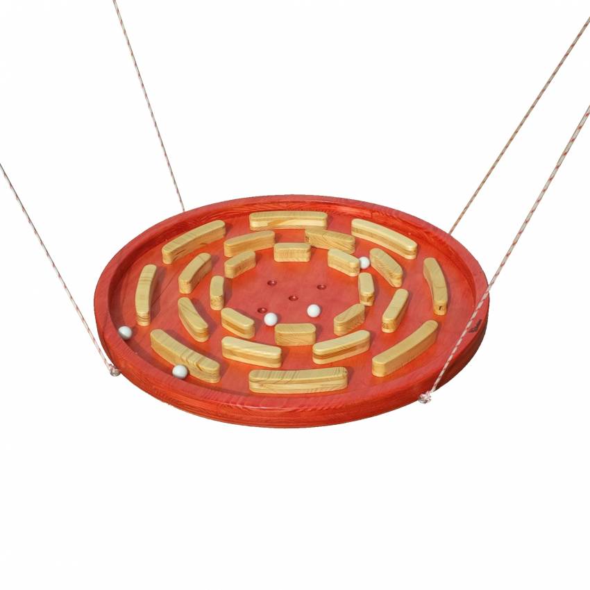 Règle du jeu : Les joueurs tiennent chacun une poignée (ou deux). Ils tentent ensemble d’amener 5 billes dans les trous du milieu Pour facilité le jeu vous pouvez raccourcir les ficelles…